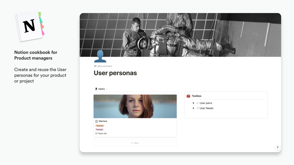 - User personas template. Assisted by Notion AI (recommended but not mandatory, the template is set to work either way)